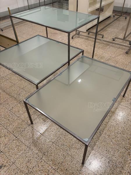 TAVOLI N. 4 tavoli in ferro e ripiano in vetro acidato misure 120x120x90h; 120x80x90h; 120x80x45h.; 110x110x45h. Prezzo euro .70 cad. Tel. 333/7943113