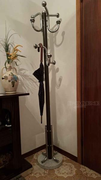 stile anni 90, con struttura e pomelli color argento e rifiniture in nero, base in marmo venato, bianco rotondo, H 170 e largo 36. prezzo 60 euro