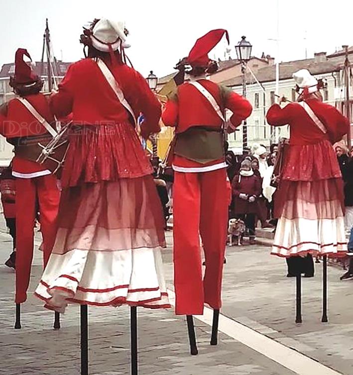 Animazione itinerante con due trampolieri guidati da un folletto in bici che improvvisa numeri di clownerie lungo il Porto Canale.
