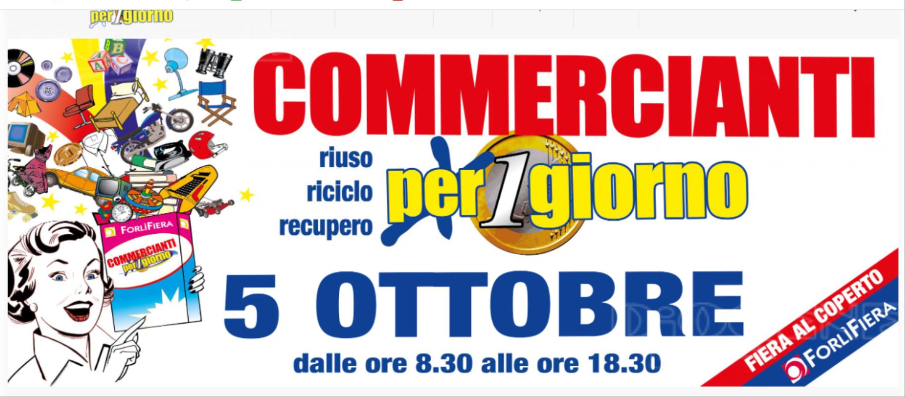 La grande stagione di eventi organizzati da Romagna Fiere riparte con l’appuntamento più atteso. Torna alla Fiera di Forlì Commercianti per un giorno, l’appuntamento con il risparmio e l’acquisto utile e intelligente. Domenica 5 ottobre, dalle 8.30 alle 18.30, i padiglioni di via Punta di Ferro si apriranno alla manifestazione totalmente ed esclusivamente dedicata ai privati senza partita Iva, associazioni, enti di beneficenza i quali, per un'intera giornata, potranno vendere, comprare o scambiare merci e prodotti di loro proprietà.