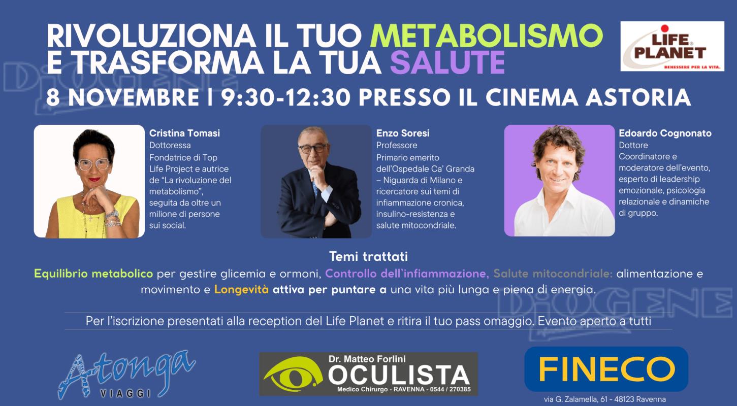 La Dott.ssa Cristina Tomasi e il Prof. Enzo Soresi, esperti di metabolismo, infiammazione e longevità, moderati dal Dott. Edoardo Cognonato, specialista in leadership emozionale e dinamiche di gruppo, tratteranno di Equilibrio metabolico per gestire glicemia e ormoni, Controllo dell’infiammazione, Salute mitocondriale: alimentazione e movimento, Longevità attiva per puntare ad una vita più lunga e piena di energia.