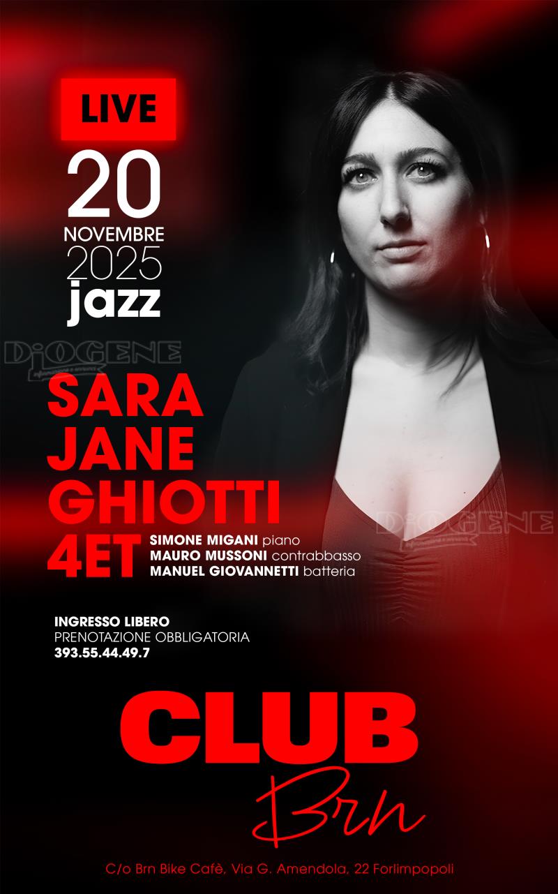 Il Club BRN di Forlimpopoli si trasforma in un locale jazz dal sapore internazionale ospitando per il suo primo live la cantante arrangiatrice anglo-sammarinese Sara Jane Ghiotti, che Giovedì 20 Novembre dalle ore 21.00 accenderà l’atmosfera del Club accompagnata per l’occasione da Simone Migani al piano, Mauro Mussoni al contrabbasso e Manuel Giovannetti alla batteria.