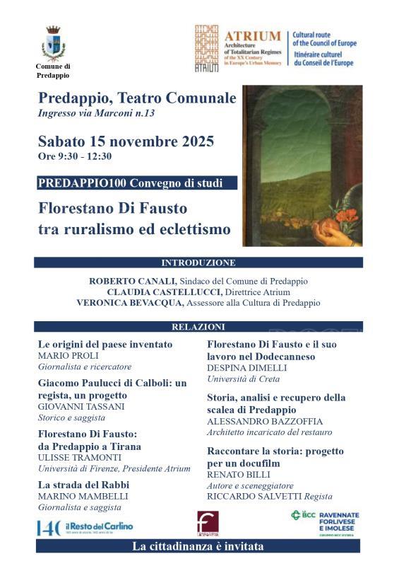 L’evento, in programma sabato 15 novembre 2025 al Teatro Comunale di Predappio (ore 9.30-12.30), è promosso dal Comune in collaborazione con ATRIUM e con il sostegno della Fondazione Cassa dei Risparmi di Forlì e de LA BCC ravennate, forlivese e imolese. La sessione chiama a raccolta personalità di spicco del mondo accademico e culturale e ha come filo rosso l’opera architettonica di Florestano Di Fausto, figura di primo piano nella progettazione di Predappio Nuova.