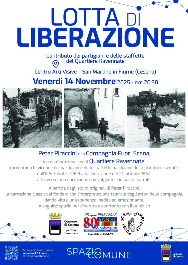 Venerdì 14 novembre, alle ore 20:30, al Centro Arti visive e sceniche di San Martino in Fiume (via Fusconi, 59) andrà in scena l’evento ‘Lotta di Liberazione'. Il contributo dei partigiani e delle staffette della periferia’ a cura di Peter Piraccini e la Compagnia Fuori Scena.