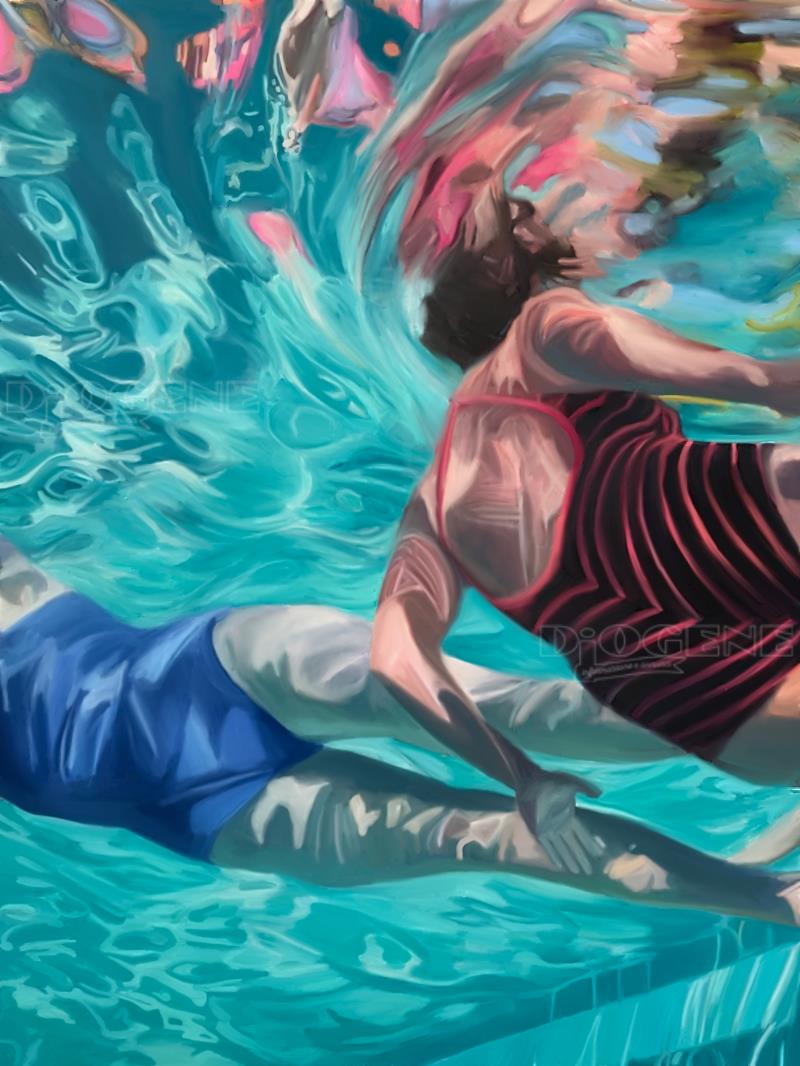 L’artista cattura con una pennellata liquida e vibrante le sensazioni generate dall’acqua: il rumore delle onde, l’ebrezza del primo tuffo che taglia il caldo, la salsedine sulla pelle.