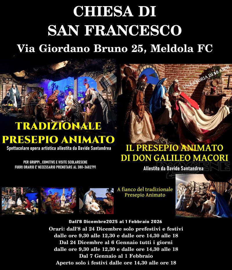 Meldola, – Un evento eccezionale per la Romagna: dall'8 dicembre 2025 al 1 febbraio 2026, il regista e presepista Davide Santandrea presenta un grande e monumentale presepe animato presso l'antico convento francescano adiacente alla Chiesa di San Francesco a Meldola (Via Giordano Bruno 25).