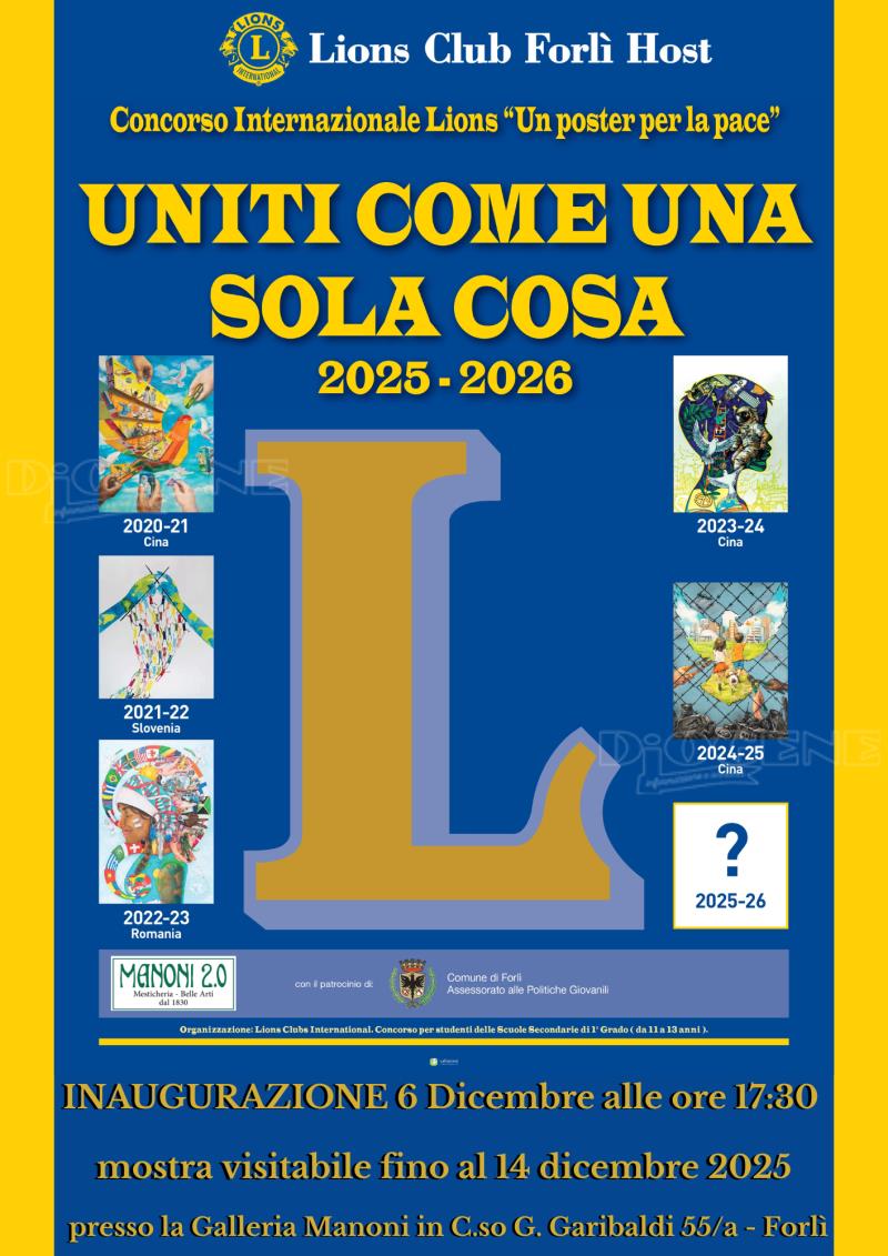 Il Lions Club Forlì Host invita la cittadinanza alla mostra dei lavori realizzati dagli studenti forlivesi di 8 plessi scolastici per il concorso internazionale “Un Poster per la Pace”, edizione 2025/26, sul tema “Uniti come una cosa sola”.