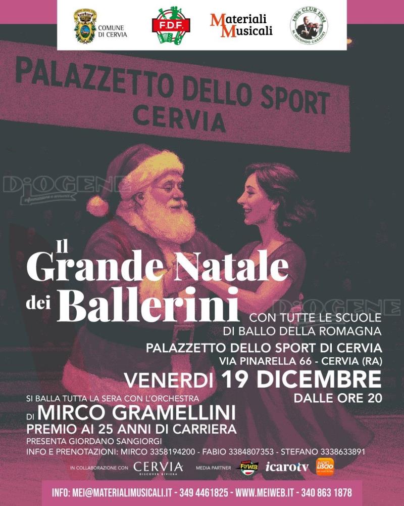 Si terra’ a Cervia, che diventa cosi la piu’ grande Balera di Romagna per le Fesetivita’ di Natale,venerdì 19 dicembre a partire dalle ore 20 al Palazzetto dello Sport di Cervia, il primo Grande Natale dei Ballerini a cura della Federazione Danze Folk, la piu’ grande federazione delle migliori scuole di ballo della Romagna, sui ritmi del’orchestra di Mirco Gramellini.