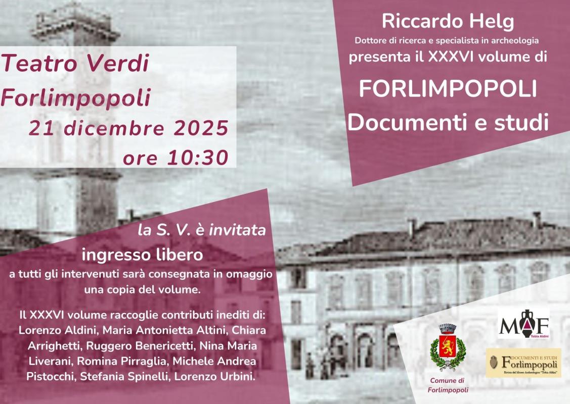 Domenica 21 dicembre 2025, alle ore 10.30, nel Teatro Verdi di Forlimpopoli, piazza Fratti (all'interno della Rocca) verrà presentato il XXXVI volume della rivista “Forlimpopoli, Documenti e Studi”. Interverrà Riccardo Helg, dottore di ricerca e specialista in archeologia, con una lunga esperienza nel campo della ricerca e della divulgazione scientifica.