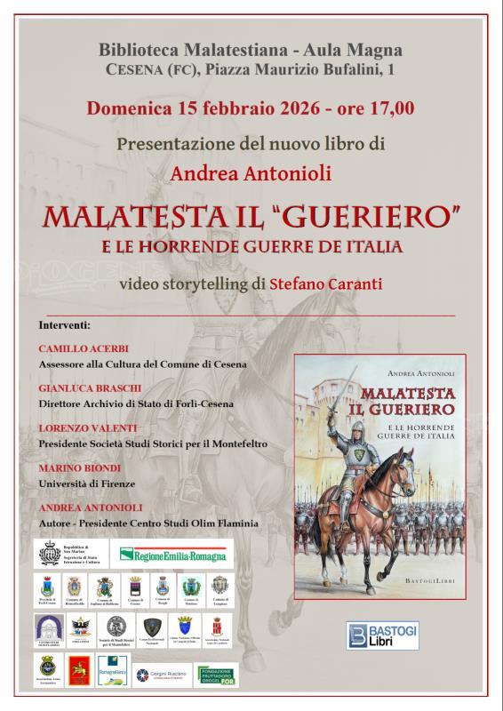 Domenica 15 febbraio 2026 alle ore 17,00 presso l’Aula Magna della Biblioteca Malatestiana di Cesena (FC), avrà luogo la presentazione del nuovo progetto di Andrea Antonioli, dedicato a una figura potente e dimenticata riemersa dalle fitte nebbie della Storia: Malatesta il “Gueriero”, protagonista delle «horrende guerre de Italia», simbolo dell’audacia rinascimentale.
