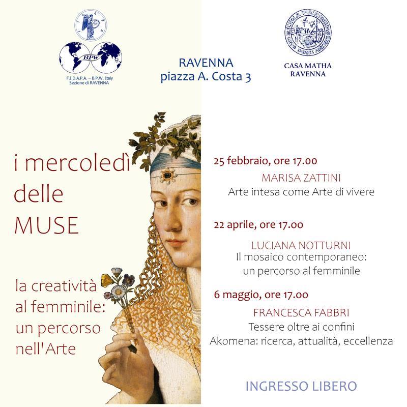 Mercoledì 25 febbraio 2026 alle ore 17:00 prende inizio il ciclo di conversazioni dedicato a donne che si sono distinte per le proprie attività artistiche, anche in ambito internazionale, “I MERCOLEDÌ DELLE MUSE. La creatività al femminile: un percorso nell’Arte.” a cura di FIDAPA BPW Italy sezione di Ravenna in collaborazione con Ordine della Casa Matha.