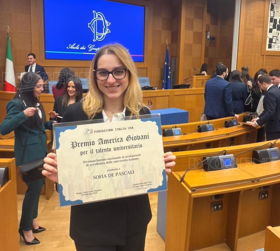 La ventiduenne forlivese Sofia De Pascali, laureata in Scienze internazionali e diplomatiche all’Università di Bologna, Campus di Forlì, è tra i vincitori del Premio America Giovani per il talento universitario. Il prestigioso riconoscimento, promosso dalla Fondazione Italia-Usa, dedicato ai migliori neolaureati italiani, le è stato assegnato perchè si è distinta per studi accademici di eccellenza e un curriculum formativo di alto profilo.