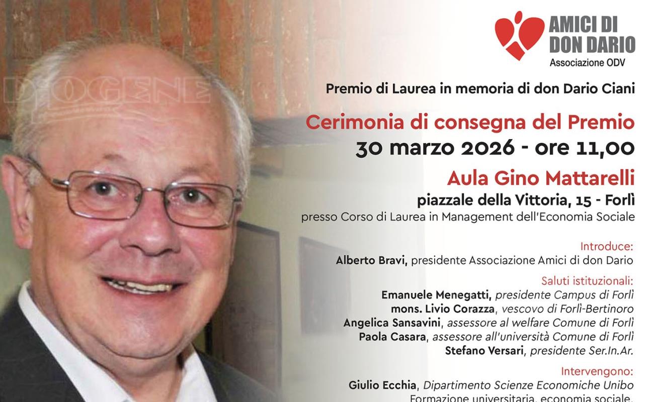 L’associazione Amici di don Dario di Forlì, in collaborazione con il Corso di Laurea in Management dell’Economia Sociale dell’Università di Bologna (Campus di Forlì) e con il patrocinio di Ser.In.Ar. ha istituito un Premio di Laurea dell’importo di euro 2.000,00 in memoria di don Dario Ciani. Il premio, destinato a laureati degli ultimi tre anni accademici del già citato corso di laurea, presenta il tema “Innovazione sociale, valorizzazione delle fragilità umane tramite processi lavorativi sostenibili”.