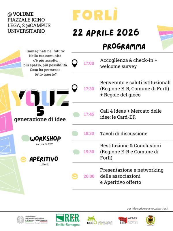Al centro della tappa di Forlì ci sarà il territorio, con le sue specificità e i suoi bisogni. YOUZ è infatti uno spazio di partecipazione pensato per raccogliere idee, proposte e visioni che nascono direttamente dai contesti locali, favorendo un dialogo diretto tra giovani, amministratori e istituzioni.
