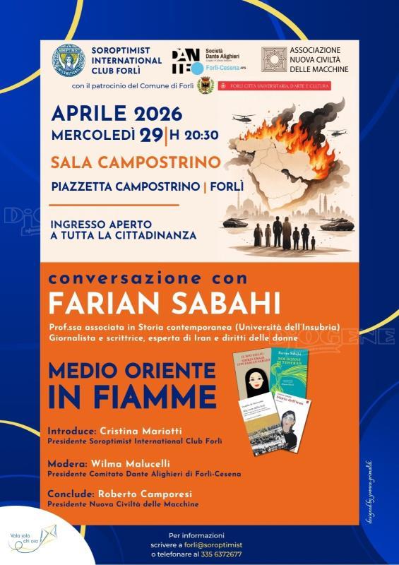 Per cercare di comprendere le cause alla base di questo stato di tensione, che sembra non avere fine, e per fornire alcuni elementi di chiarezza su vicende così gravide di rischi per la pace mondiale, le associazioni Soroptimist International Club Forlì, Nuova Civiltà delle Macchine, e la Società “Dante Alighieri” di Forlì-Cesena hanno promosso un incontro pubblico per mercoledì 29 aprile, alle ore 20:30, presso la sala Campostrino, con la prof.ssa Farian Sabahi, docente all’Università dell’Insubria, esperta di Iran e diritti delle donne.