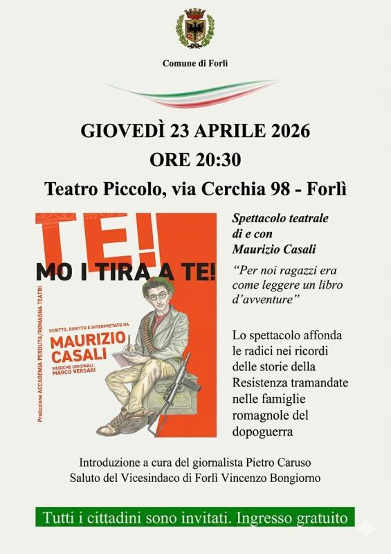 Giovedì 23 aprile, alle ore 20:30, andrà in scena al Teatro Piccolo, via Cerchia n. 98, la rappresentazione teatrale “Mo i tira a te!”, spettacolo sulla Resistenza scritto, diretto e interpretato da Maurizio Casali.